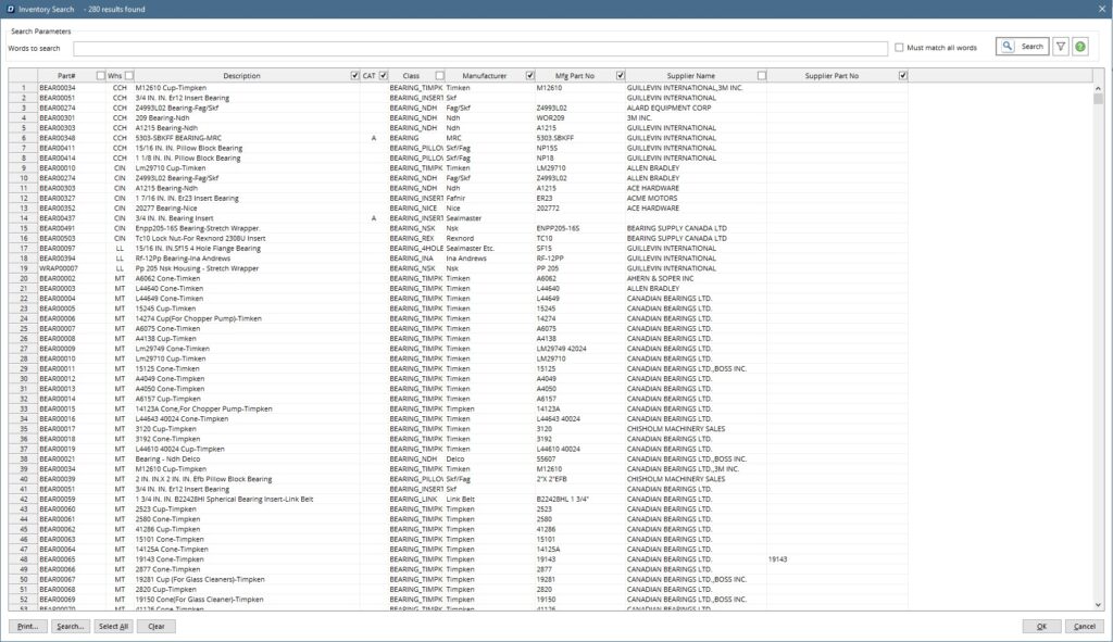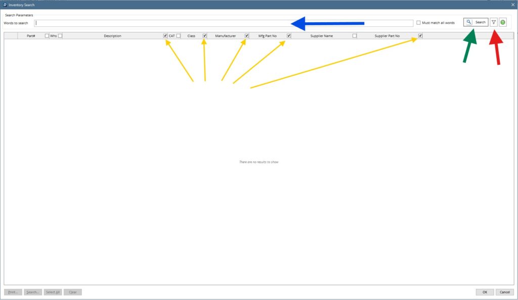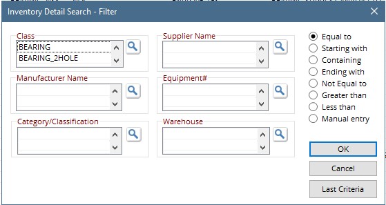 Similar to the original search screens, enter one or more criteria to narrow down search results. Use the radio button hotkeys on the left when you only have part of the criteria, i.e one word in the manufacturer’s name.
