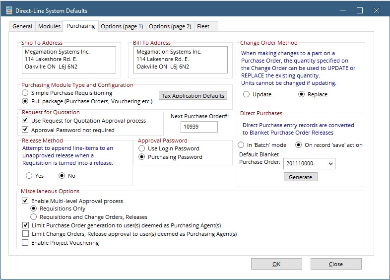 When setting up Directline’s purchasing system, there are several options available. This article will go through the Purchasing tab of the Directline System defaults screen.
